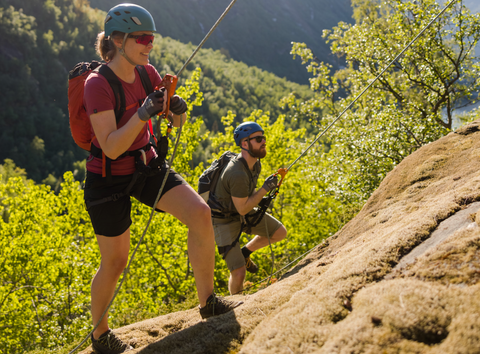 Explore Geiranger has established a steep trail secured with rope the entire way up to the viewpoint. This is not a trail you can walk without a climbing harness and JUMAR (security device). Steep ascents and simple climbing require securing! The trail passes through the deciduous forest where small ascents provide an exciting and creative nature experience. In between, there are clearings where you can see through the forest towards Geiranger center. Eventually, the trail passes up through a rock with a good view of the Geirangerfjord. On the rock we have fixed double ropes which provides great photo opportunities. The last part of the trail goes through open landscape up to the viewpoint itself. Our guide is happy to take a group photo at the viewpoint. After a short break at the viewpoint, the rappelling starts! The rappelling route consists of three parts: the intro wall, the vertical wall (50 meters high) and the slope wall (40 meters high).