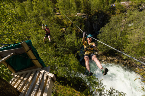 Norway's first double zipline allows you to fly parallel with another person through four short and longer stretches, with a view of the UNESCO nature from treetop to treetop, over ravines and waterfalls. The park is designed to be both exciting and fun to explore on your own, with a balance between climbing, balancing on bridges, walks in the forest, and the spectacular zipline. You can rent equipment at the guide office and explore the area yourself, with guides stationed in the park to ensure safety for all guests. Create a fun and exciting day with friends or family with us in The Dynamite Waterfall Zipline Park.